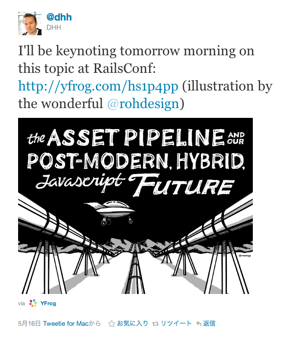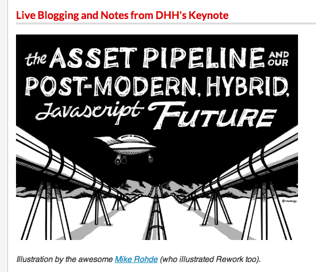 今回のDHH氏のスピーチは「The Asset Pipeline and our Post-Modern, Hybrid, Javascript Future」と題したもので、来るべきRails 3.1の新機能紹介が中心となっています。が、今回はその内容ではなく、スピーチに使われたスライドのイラストにまつわるエピソードを紹介します。