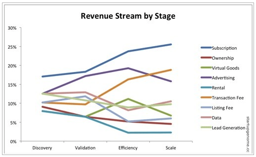 発見期、確認期、効率期、拡大期の4つのステージでの収益のパターンを業種別に示した図です。たとえば購読モデルの場合、サービスの拡大の時期に大きく収益の成長が望めることになります。