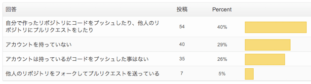 「githubどこまで使ってる?」というアンケートにも多数回答があり、約70%の方がアカウントを持っていて、全体の45%がアクティブに利用中との結果となりました。
