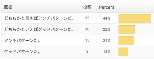 アンケートの結果は以下のとおり。「どちらかと言えばアンチパターン」を選んだ人がいちばん多かったものの、1/3程度の人はグッドパターンだと考えているという結果でした。
