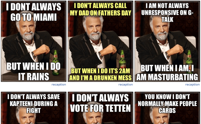 その後このCMはTIMEが選ぶベストCMTOP10に選ばれるなどしてじわじわと評価されていきます。非公式のサイトやツイッターアカウントなども作られて行きました。多くのパロディ動画や実際のCMでのパロディなどを経て“I don’t always x, but when I do, I y.”(普段は○○しないけど、する時は○○する)の形で使われるようになっていきました。