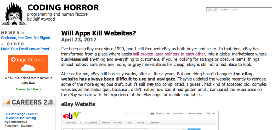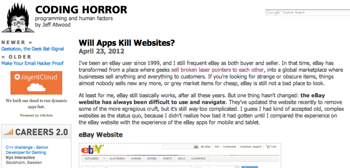 A-Listers的にはかなりプッシュしているCoding Horrorに”Will Apps Kill Websites?”と題されたスマートフォン・タブレットのアプリとWebサイトの今後について考察した記事が投稿されていました。記事はeBayが多くに人に使われていて、筆者にとっても有用でさまざまな出来事が起きている事を前置きした上で、「eBayのWebサイトが常に使いづらく閲覧しづらいままだった」事は不変であると述べています。その上でアプリ版eBayとWebサイト版のeBayの比較を行なっています。