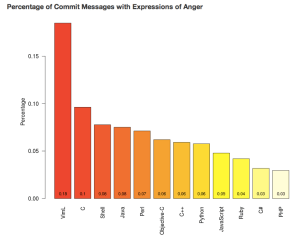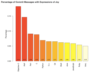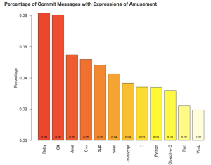 いやいやもっと楽しい言語あるでしょ?と思った方にとっても興味深い調査結果がExploring Expressions of Emotions in GitHub Commit Messages(GitHub上のコミットメッセージの感情表現の調査)として公開されていました。記事の作者はベルリンのRamiro Gómezさんで、自然言語とプログラミング言語の双方に関心のある彼はGitHubが公開した統計情報からさまざまな感情表現をコミットメッセージから探して分析するという調査を行いました。これによりanger(怒り), joy(喜び), amusement(楽しみ) surprise(驚き)の表現が多く使われているプログラミング言語のランキングを生成して公開しています。