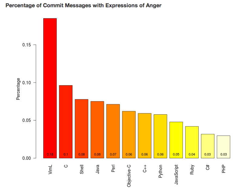 怒りのランキングではangry(腹を立てる)、annoying(いらいらする)、cranky(酷い)、hate(嫌い)といった単語を抽出し、結果的には2位にダブルスコア近い差をつけてVimLがトップに輝いています。次いでCやShellなどもインストーラーが全てのファイルを削除するといったクリティカルな問題に発展しそうな気配があり、そういうものなのかなという気がします。