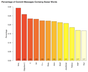 所謂、Disり合いについても分析が行われ、ここではいわゆる罵倒表現達(wtf等)を抽出しています。堂々のトップに輝いているのはVimLです。また意外にもPHPは下位に沈んでいます。なお例として抽出されたコメントが例示されているのですがこの項目についてはとてもストレートな感じでわかりやすいです。