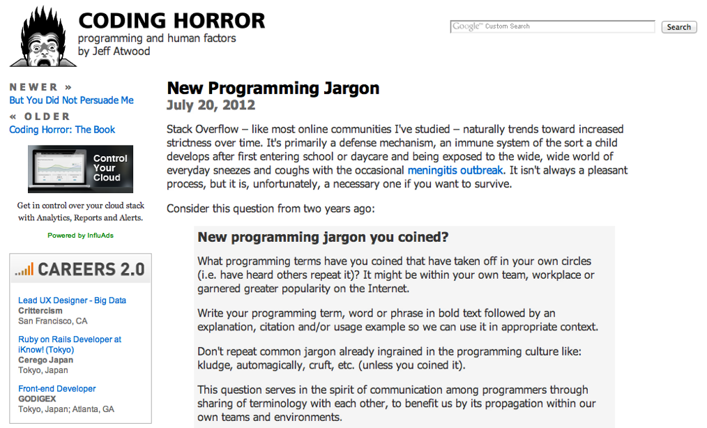 このエントリの元になったのはStack Overflow上で行われた「あなたが新しく作ったプログラミングのジャーゴンはなんですか?(New programming jargon you coined?)」という質問です。この質問にはなんと386もの回答が寄せられ、その中でStack Overflowのコミュニティの投票で上位になった30のジャーゴンをリストにして解説したのがCoding Horrorの「Coding Horror: New Programming Jargon」という記事です。