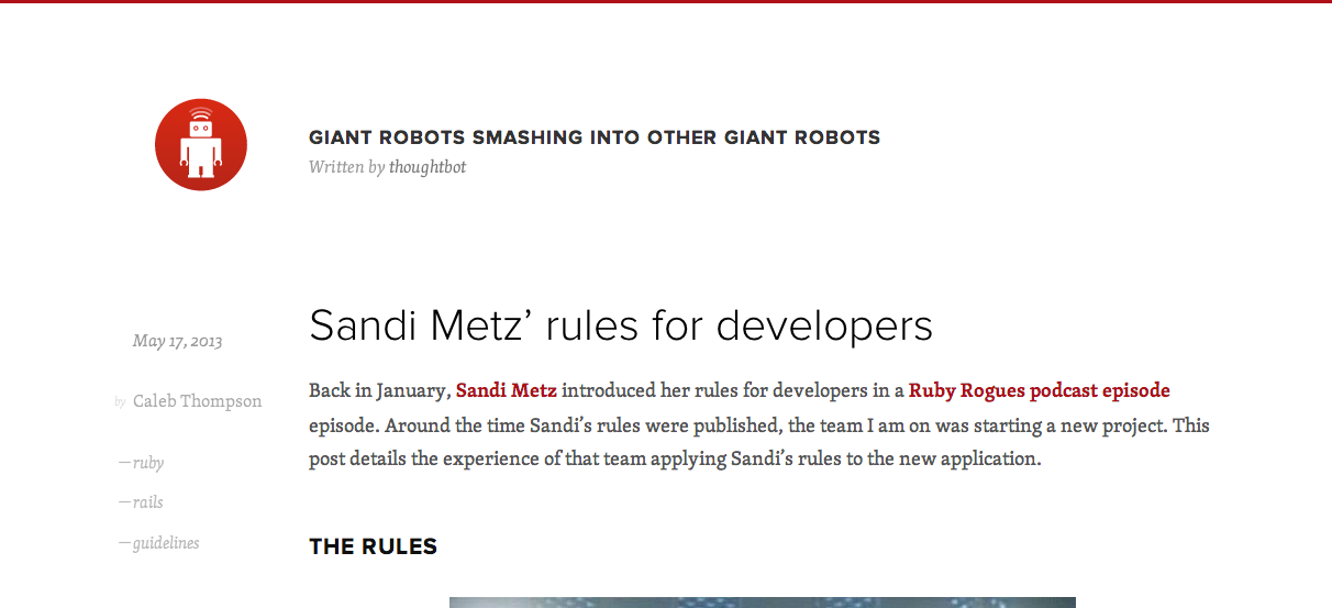 Webアプリやモバイルアプリの受託開発やコンサルティングを行うthoughtbot社のブログにて、Sandi MetzルールというRubyプログラマ向けのルールが紹介されていました。