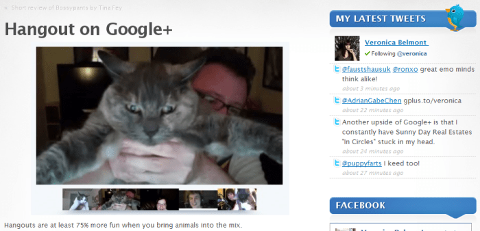 全世界160万人の美しすぎるギーク、ベロニカファンのみなさん、おはようございます。ベロニカもすでにGoogle+上で人気のユーザーの上位に入っていますが、そんなベロニカもかなりの時間をGoogle+で費やしているそうです。そして彼女が自身のブログで薦めるのはペットをカメラ前に連れてきてHangoutのチャットをすること。これにより最低でも75%は楽しさが増すという事です。