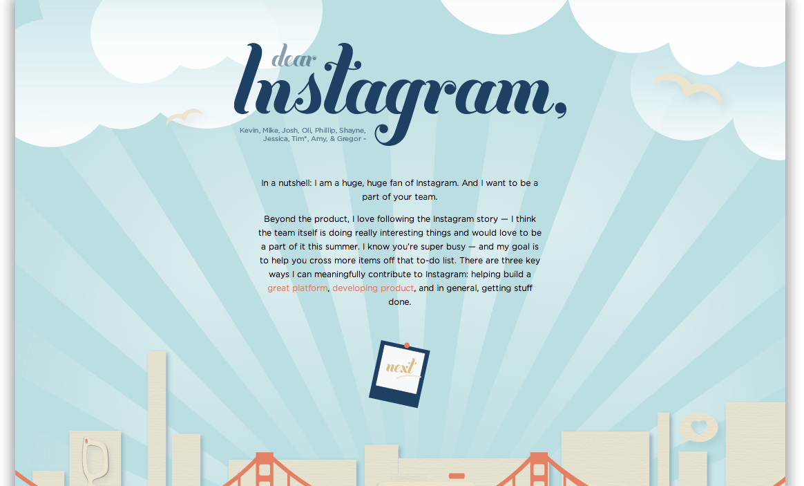 就職してみたい企業に対して超積極的なアピールをした若者が話題になっています。20歳の学生、Alice Leeさんは自分のスキルと熱意をInstagramへのオープンレターという形のサイトにして公開しました。そのデザインの素晴らしさは実際のページを見てもらうとして、ページにはAliceさんがどのような貢献をInstagramにできるのかが外部のサイトへのリンクなども踏まえて紹介されています。