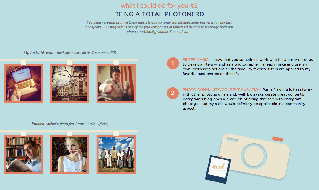 InstragramのAPIを使った作品やフリーランスの作品などもしっかりと紹介されています。また彼女がMicrosoftとfoursquareで開発者コミュニティを盛り上げる経験をした事も書かれています。すごい説得力です。