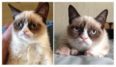 筆者のタイムラインにこの所海外からよく流れ込んでくるのがこのネコの写真です。これはGrumpy Cat(気難しいネコ)という名前でミームになっているTardちゃんで、飼い主はアリゾナのTabatha Bundesenさんです。この写真が有名になったのはReddit上に投稿された2012年9月23日以降です。そこからさまざまなキャプションや編集された写真が大拡散しているようです。