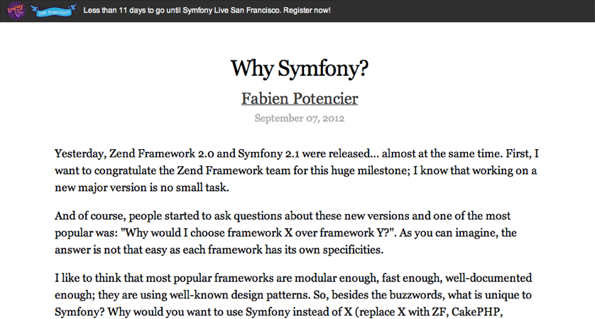オブジェクト指向を本格的にサポートしたPHP5とRailsが与えたインスピレーションから始まった2005年頃からはsymfonyやZend Framework、CakePHP、CodeIgnitierなどのフレームワークを生み出しました。その後、名前空間をサポートしたPHP5.3がリリースされるとコードの抜本的な構造などを見なおした次世代フレームワークが次々に登場します。冒頭のFabien氏の記事では2012年9月6日にZendFramework 2.0とSymfony2.1が奇しくも同日にリリースされました。Fabien氏はZendFrameworkのリリースを祝福した上で、「何故、他のXというフレームワークよりSymfonyを選ぶのか?」という質問の回答としてブログの記事を投稿しています。