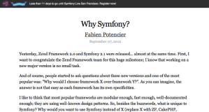 2012年9月、PHPのフレームワーク戦争は新たな局面に突入した事が明確になってきました。PHPフレームワーク、Symfonyプロジェクトの創始者であるFabien Potencier氏のブログ記事がPHPフレームワーク界で話題です。