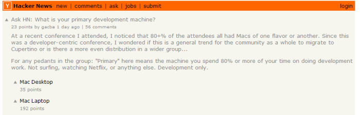 Hacker News内の質問、アンケートコーナーで挙がった質問が興味深いです。「カンファレンスに行ったらみんなMacだったんだけど、これって特別なことなの?」という僕らもよく抱く疑問です。なおここでは「80%以上の開発時間に使うマシンで動画を見るとかメール送受信やネットサーフィンをするとかいうのは含めない」という前提条件です。